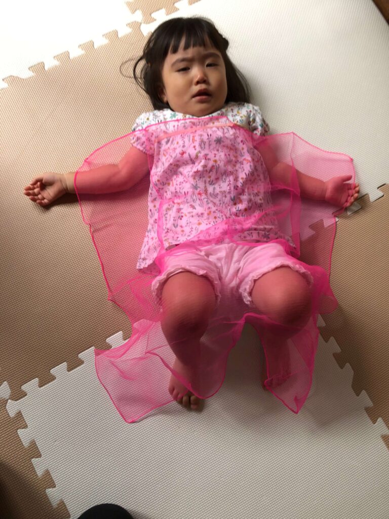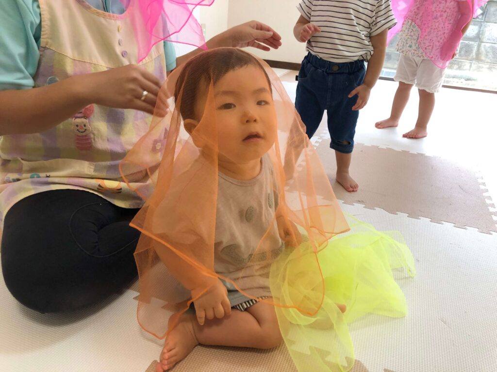 リトミックでは、オーガンジーの布がさまざまなものに変わっていきます!