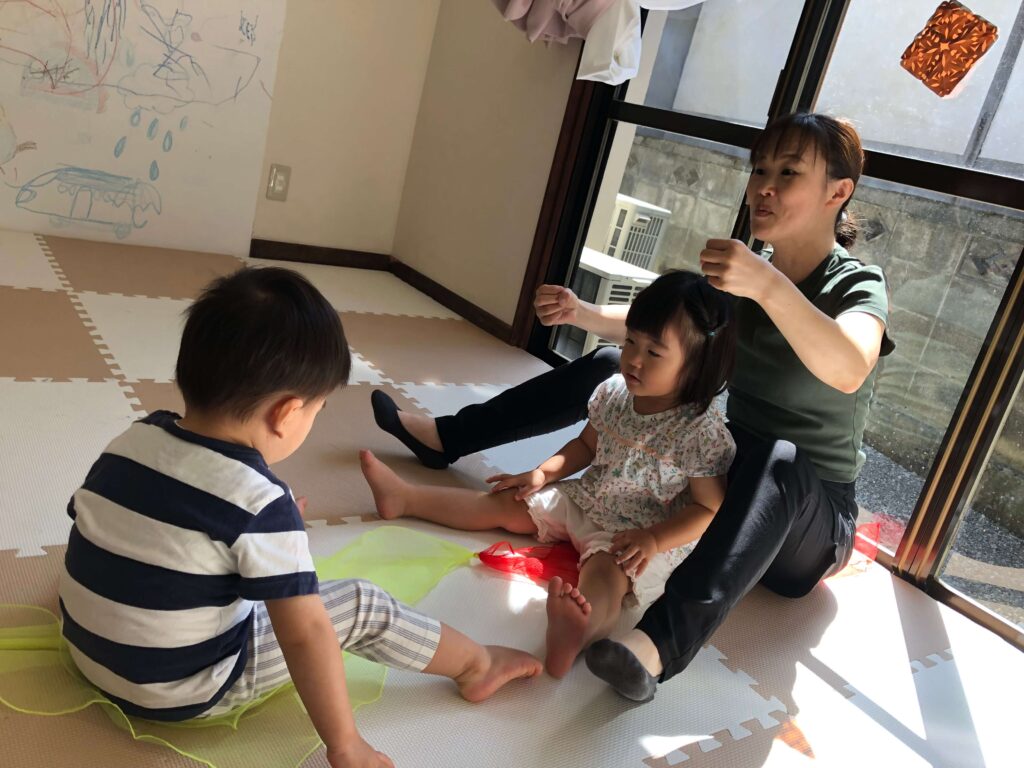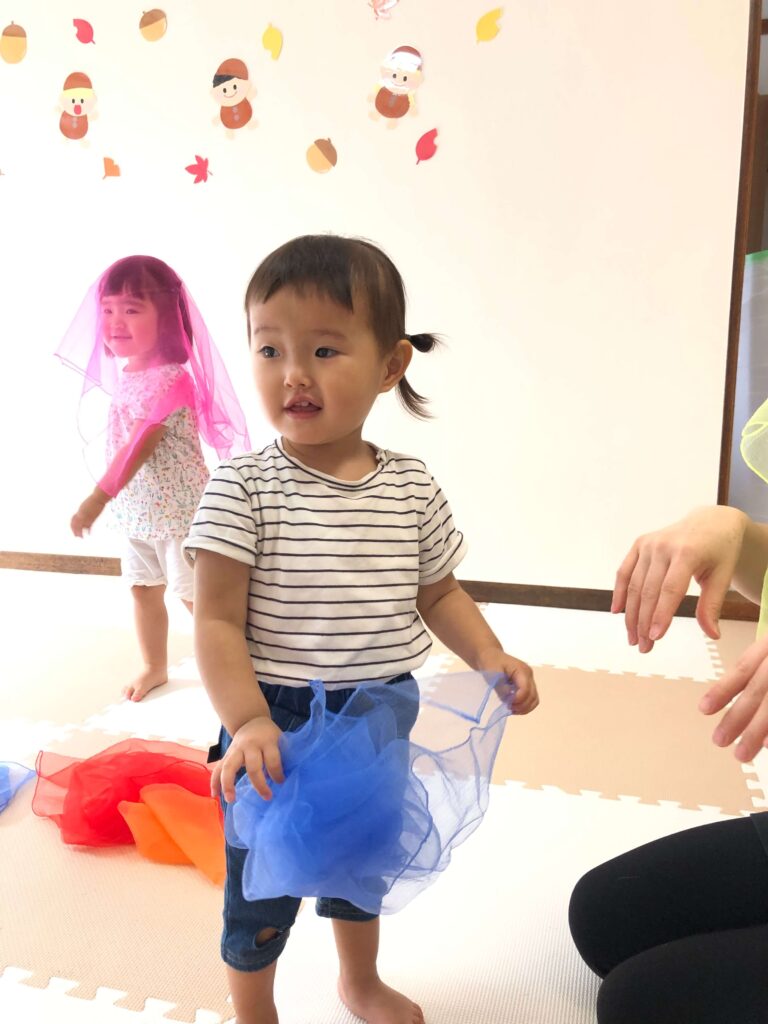 リトミックの時間が終わった後も、子どもたちは布を手に取り、自分たちだけの遊びを続けていました。