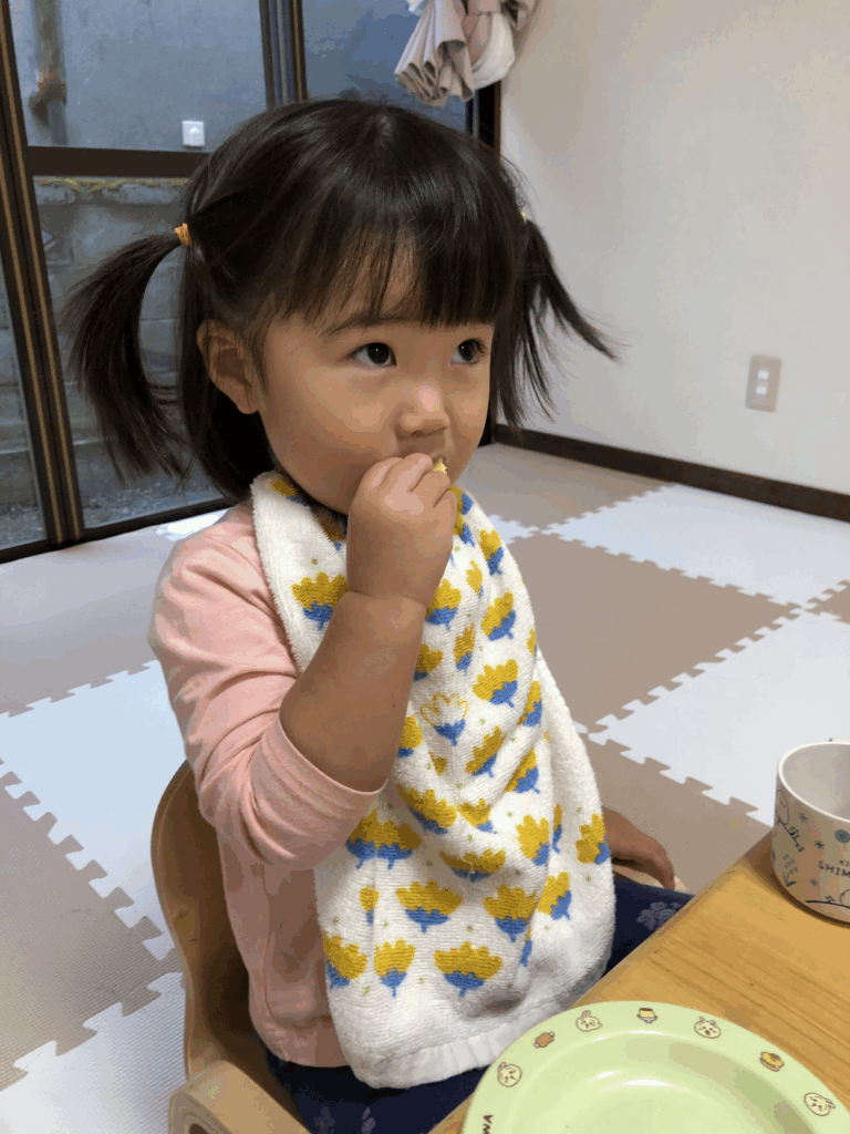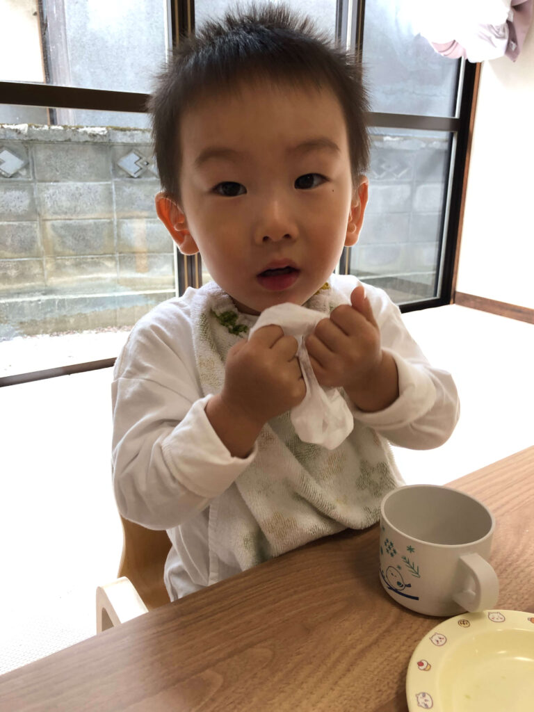 エプロンを自分でつけたり、食後にお口を拭いたりと、簡単な身の回りのことにチャレンジする姿が多く見られるようになりました!