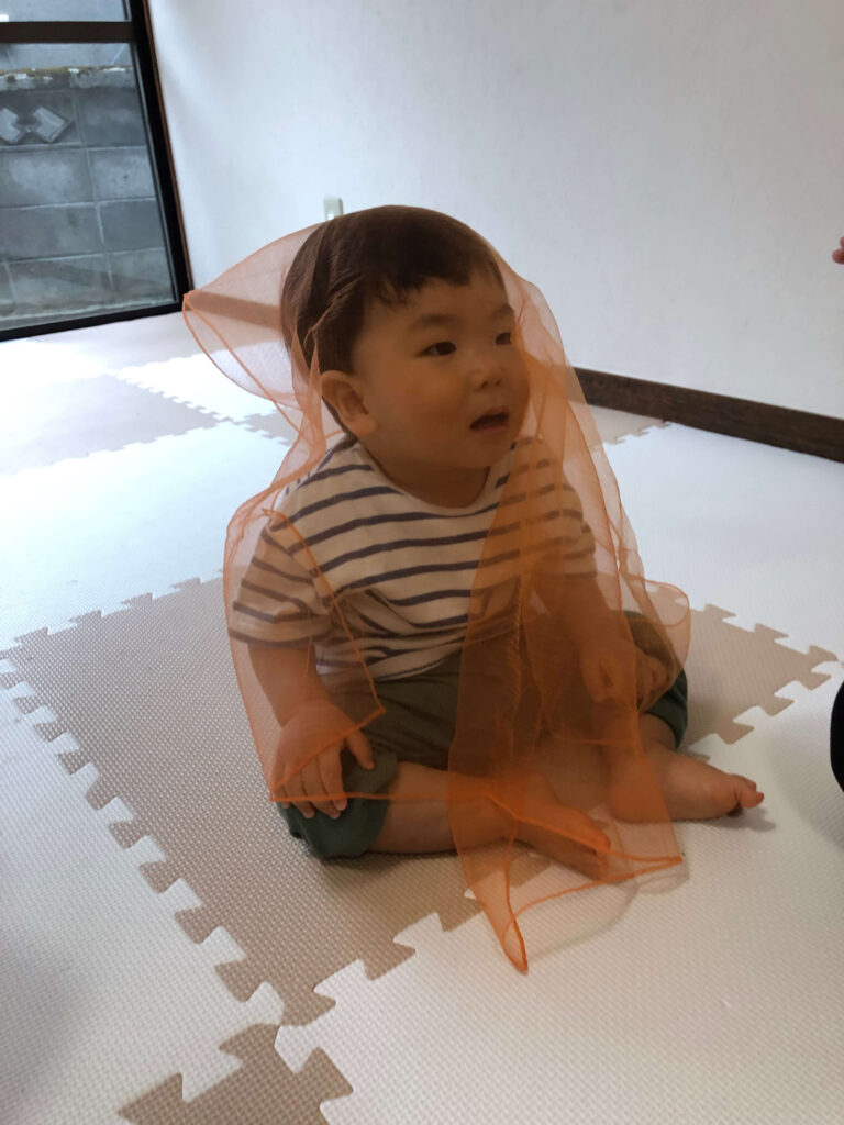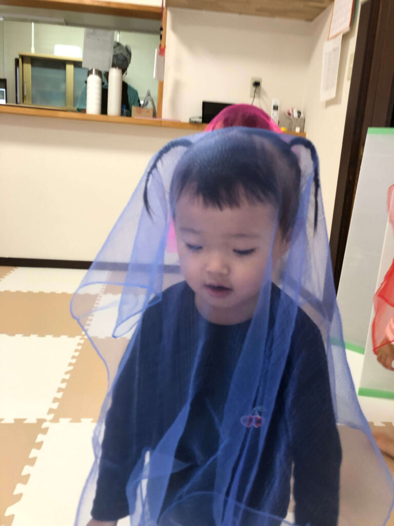 もうすぐやってくるハロウィンに合わせて、カラフルなオーガンジーの布を頭からかぶって「おばけだぞ〜♪」と元気いっぱいに走り回る姿は、可愛らしいお化けたち!