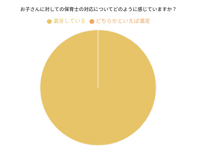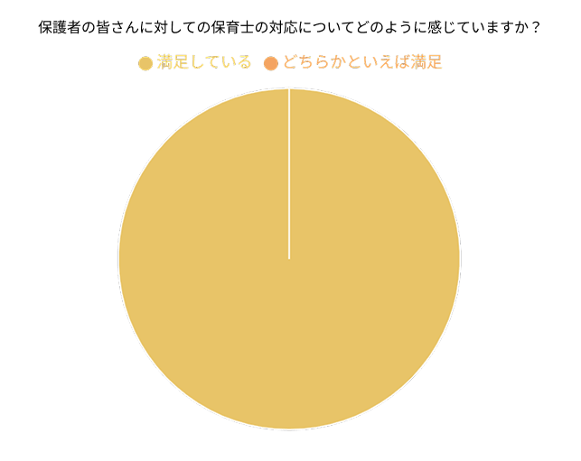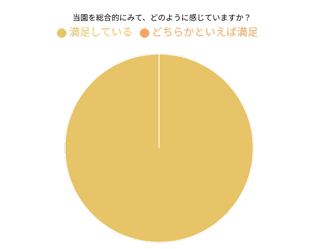アンケートにご協力いただき、ありがとうございました。開園したてではありますが、日々の保育について温かい評価をいただけたこと、大変うれしく思っております。できる改善点については、真摯に受け止めながら、より良い保育ができるよう努めてまいります。