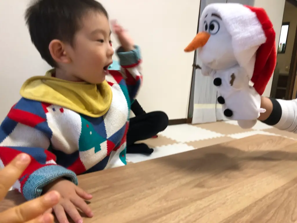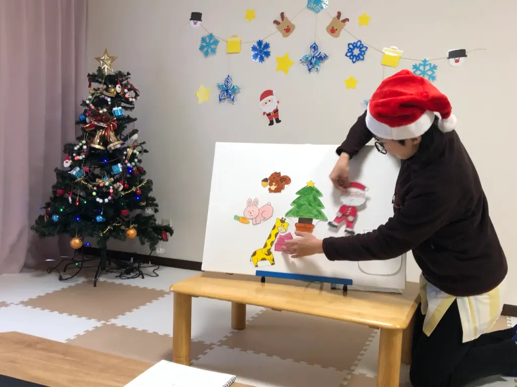 サンタさんやトナカイさんに変身した、かわいらしい姿で登園してきた子どもたち。お部屋がクリスマス仕様に飾り付けられ、いつもと違う特別な雰囲気に、「今日は何が始まるのかな?」と目を輝かせながら周りを見渡していました。