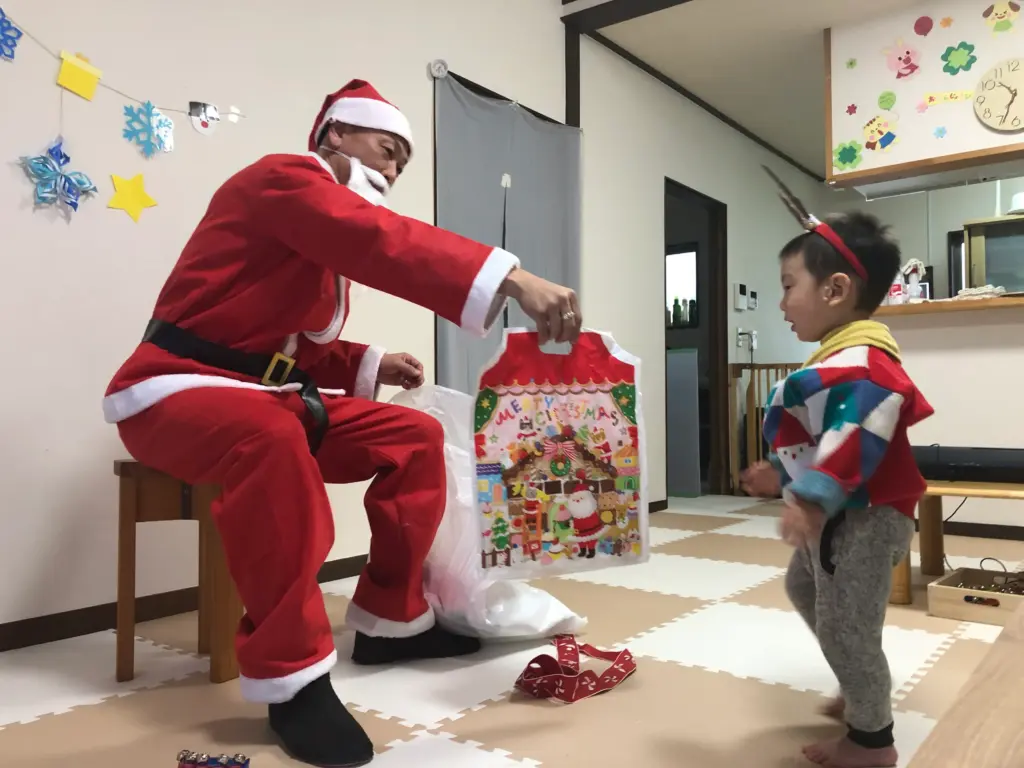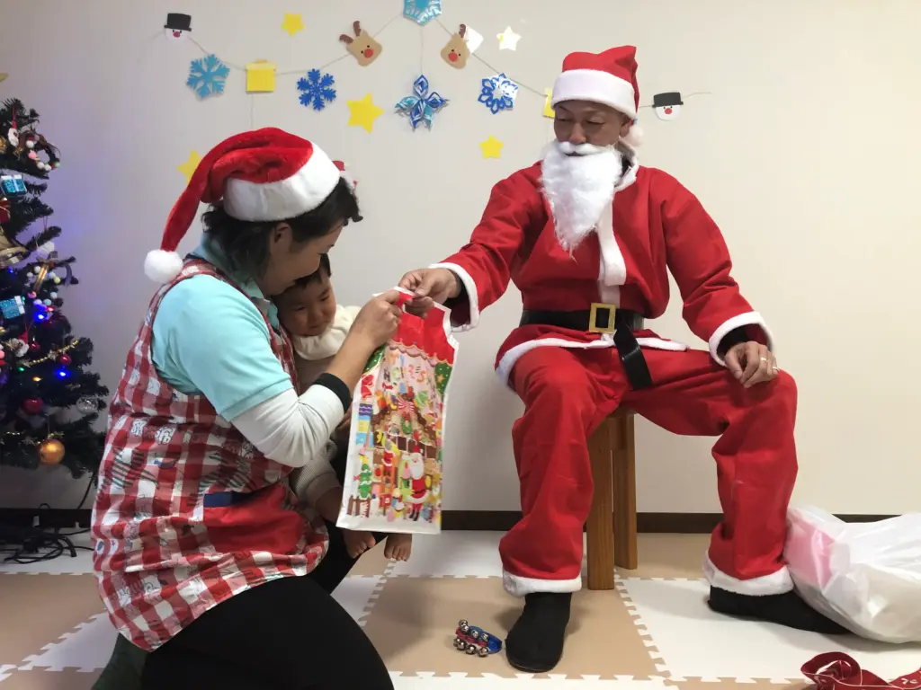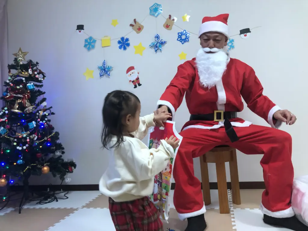 初めて間近で見るサンタさんに、最初はちょっぴりドキドキしていた子どもたちですが、優しいサンタさんからプレゼントをもらうと、みんなニッコリ笑顔に。最後はみんなでサンタさんと一緒に記念撮影📸をして、とっても素敵な思い出となりました。